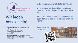 Maak van de gelegenheid gebruik om informatie over onze school en het schooltype Realschule te verzamelen en ook om een gesprek aan te gaan: -"Wegweiser Schule" in de Bürgerhalle, 22 november 2024 -Info-ouderavond van de FNRS, 16 december 2024, 18.00 uur